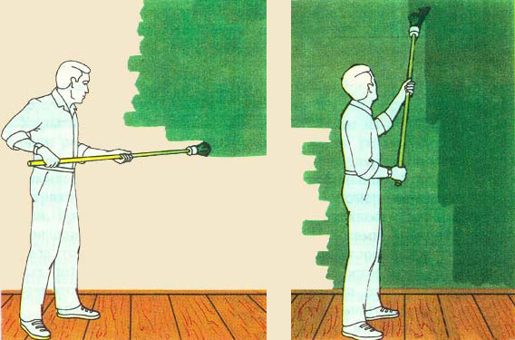 Окрашивая стены, штрихи делают вертикальными от пола до потолка. Если же окраска стен проводится в два слоя, то первый слой делают горизонтальным, а второй вертикальным, если же окрашивают стены в три слоя, то два первых слоя окрашивают горизонтальными штрихами, а последний слой вертикальными. В любом случае последний нанесенный слой нужно наносить от пола до потолка, то есть вертикальными штрихами.